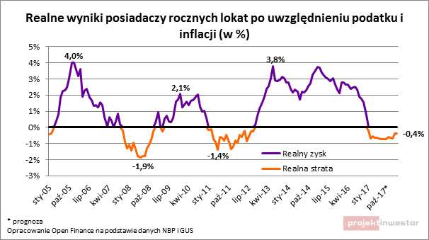 Przykład? Przeciętna roczna lokata założona w lutym oprocentowana była na 1,62%. Przy depozycie na 10 000 zł oznacza to odsetki w kwocie 162 zł. Niestety nie cała ta kwota trafi na konto deponenta. Najpierw po 19% z tego zysku rękę wyciągnie fiskus zostawiając deponentowi skromne 131,22 zł. Problem w tym, że prognozy inflacji sugerują, że w lutym 2018 roku poziom cen będzie o około 1,7% wyższy niż rok wcześniej. Tym samym deponent zanotuje realną stratę w wysokości prawie 0,4%. W rozważanym przykładzie i w przeliczeniu na złotówki oznacza to utratę wartości posiadanego kapitału o około 38 zł. Nie jest to ani pierwsza ani ostatnia zła informacja dla posiadaczy lokat. Jeszcze przez wiele miesięcy trzeba się liczyć ze stratami na lokatach. Pewnym pocieszeniem może być fakt, że okresy realnych strat i zysków na bankowych depozytach przeplatają się. Te pierwsze nie trwają przeważnie dłużej niż rok czy dwa.