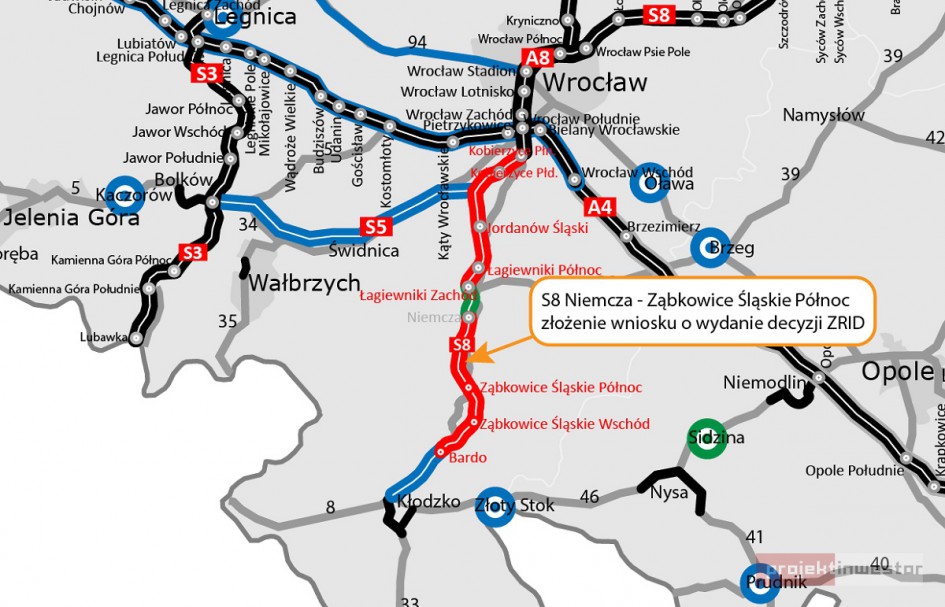 Do Wojewody Dolnośląskiej złożono wniosek o wydanie decyzji ZRID dla kolejnego fragmentu drogi ekspresowej S8, obejmującego odcinek między węzłami Niemcza i Ząbkowice Śląskie Północ. Uzyskanie tej decyzji umożliwi rozpoczęcie robót budowlanych. Zakończenie procedury przewidywane jest w drugiej połowie 2026 r.