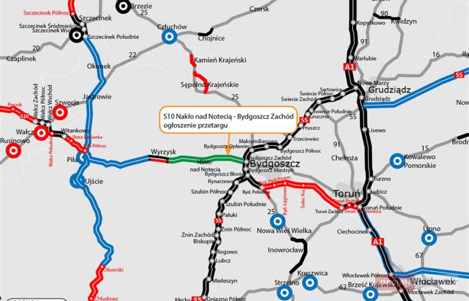 Generalna Dyrekcja Dróg Krajowych i Autostrad ogłosiła przetarg na projekt i budowę 19,5-kilometrowego odcinka drogi ekspresowej S10 między Nakłem nad Notecią a węzłem Bydgoszcz Zachód. Jest to kolejny etap realizacji S10 w kierunku Szczecina. Oferty można składać do 23 stycznia 2026 roku, a zawarcie umowy z wykonawcą planowane jest na III kwartał 2026 r.