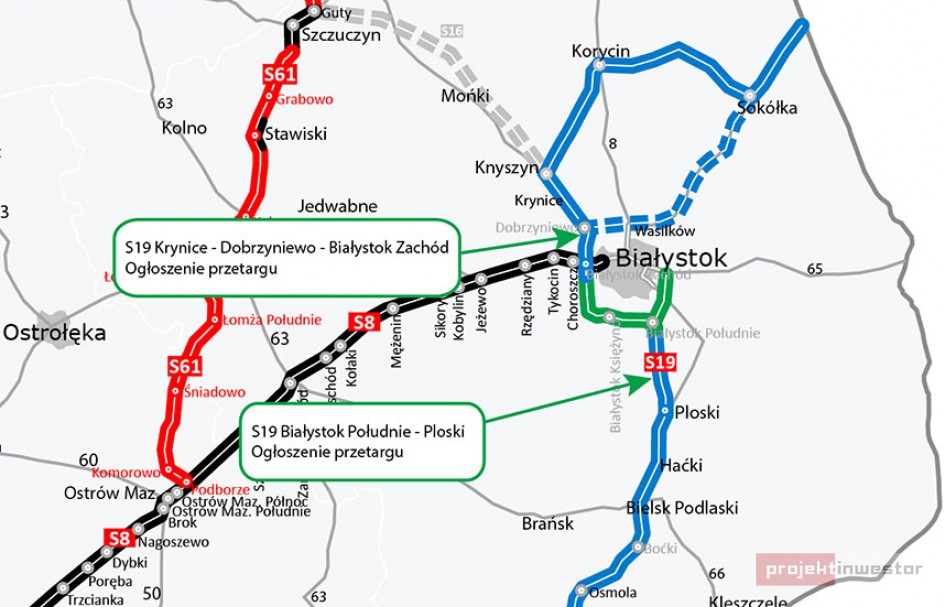 Generalna Dyrekcja Dróg Krajowych i Autostrad rozpoczęła postępowanie przetargowe na projekt i budowę dwóch fragmentów drogi ekspresowej S19. To dziesięciokilometrowy odcinek Krynice - Dobrzyniewo - Białystok Zachód oraz prawie trzynastokilometrowy odcinek od węzła Białystok Południe do miejscowości Ploski nad Narwią.