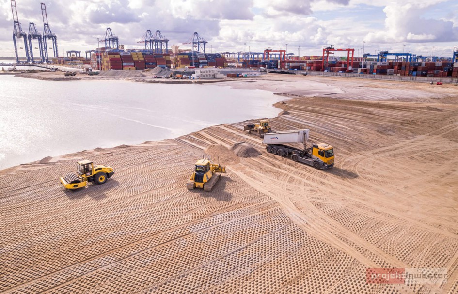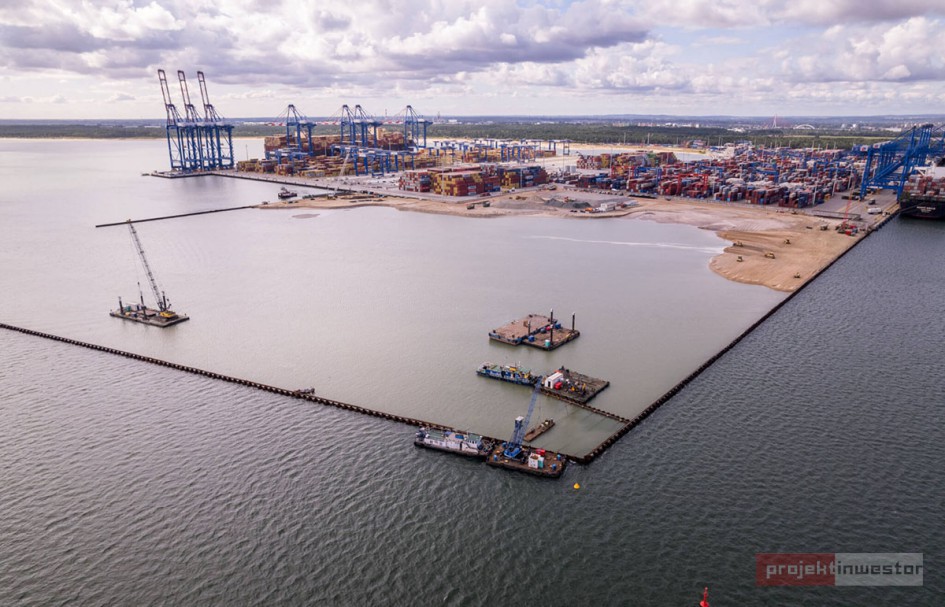 Pierwszy etap budowy obejmuje zagospodarowanie 21 ha terenu, gdzie powstaną dwa nabrzeża przeładunkowe, stanowisko Ro-Ro, place manewrowe i składowe oraz infrastruktura wspierająca logistykę dostaw elementów farm wiatrowych. Projekt, realizowany przez Grupę NDI, współfinansuje Polski Fundusz Rozwoju.