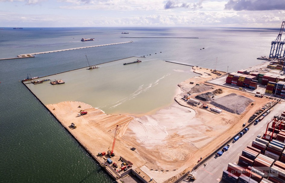 Na terenie Baltic Hub w szybkim tempie powstaje terminal T5, który w przyszłości stanie się bazą instalacyjną dla morskich farm wiatrowych. Codziennie na plac budowy trafia nawet 30 tys. m³ piasku, a prace prowadzone są równolegle na wielu frontach – od pogłębiania basenu portowego, przez montaż kotew klapowych, po przygotowanie platform roboczych pod pale CFA.