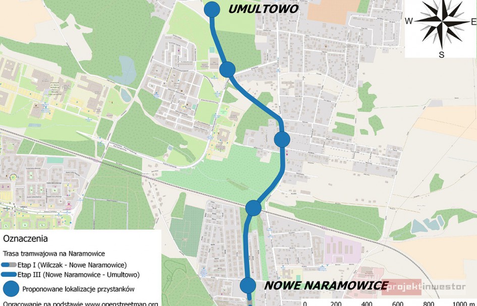 Trzeci etap ma być kontynuacją budowanej obecnie inwestycji biegnącej od pętli "Wilczak" do ulicy Błażeja oraz kolejnej planowanej realizacji polegającej na poprowadzeniu linii tramwajowej z pętli "Wilczak" do ulicy Małe Garbary. Trasa trzeciego etapu ma zaczynać się od końcówki czołowej przy ulicy Błażeja, a kończyć się planowanym zintegrowanym węzłem przesiadkowym Umultowo zlokalizowanym w okolicy niedawno wybudowanej szkoły.