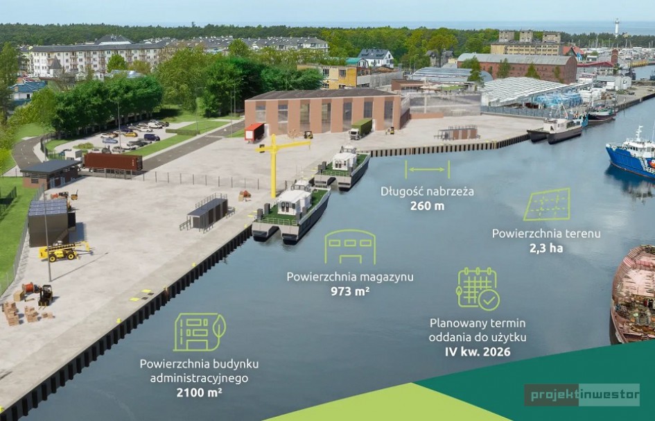 Budowa bazy operacyjnej w miejscu dawnej przetwórni ryb „Korab” obejmuje obszar o powierzchni ponad 2,3 hektara. Kompleks będzie składał się z budynku administracyjno-socjalnego, magazynu, placu manewrowego oraz nabrzeża z miejscem do cumowania statków serwisowych CTV (crew transfer vessel). W projekcie uwzględniono także place parkingowe, a całość uzupełnią tereny zielone o powierzchni około 5500 mkw.
