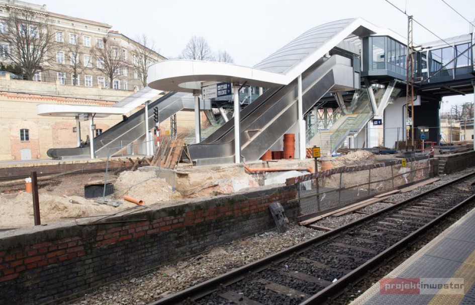 Wykonawca angażuje siły na peronie nr 2. Działa sprzęt i zespoły pracowników. Ustawiane są krawędzie peronu. Widać szykowanie fundamentów pod wiatę. Ze zgromadzonych uprzednio elementów budowane jest odwodnienie. Wykonane już prace odsłoniły stropy nad tunelem pocztowym. Teraz przygotowywane jest wylanie żelbetowej płyty.