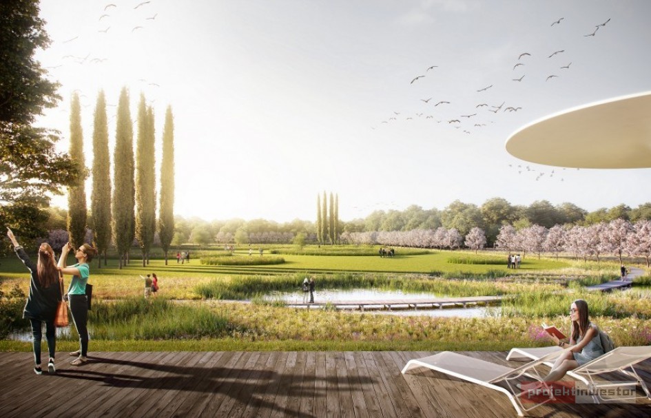 Koncepcja architektów z pracowni WXCA zakłada budowę pawilonu wody, która będzie przelewała się z dachu, tworząc kurtynę. Obiekt ten znajdzie się w pobliżu stawu. Ponadto, przy rondzie Jazdy Polskiej, powstanie pawilon powietrza, w którym znajdą się informacje dotyczące parku, ale także ekologii i zagrożeń środowiskowych.
