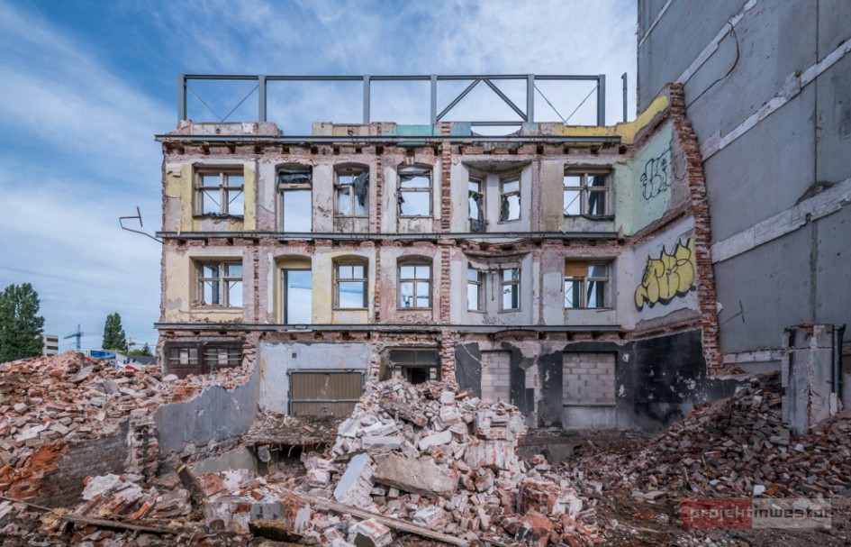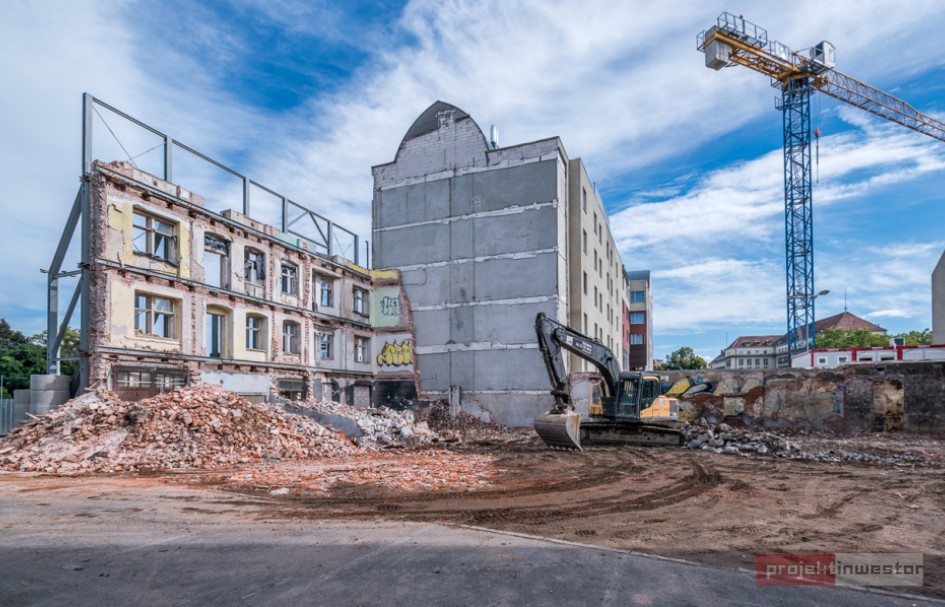 Na rogu ulicy Jagiełły trwają intensywne prace budowlano-rekonstrukcyjne. Inwestor Bouygues Immobilier zakończył dwumiesięczne prace rozbiórkowe.