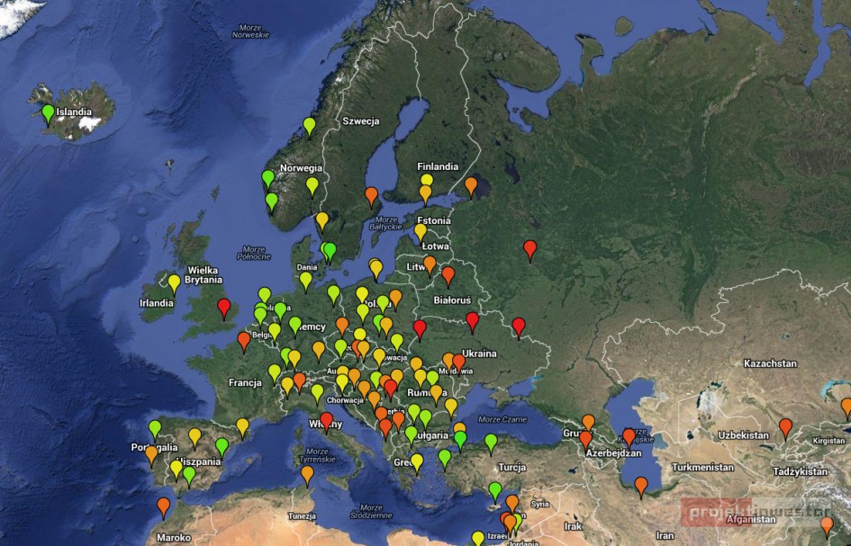 Poniższa mapa przedstawia zróżnicowanie wskaźnika P/I w metropoliach Europy (zielony znacznik - najniższe P/I - najkrótszy czas pracy na mieszkanie, czerwony znacznik - najwyższe P/I - najdłuższy czas pracy na mieszkanie). Dostępność metrażu w europejskich miastach jest bardzo zróżnicowana. Można jednak dostrzec, że metropolie Europy Wschodniej i Południowej generalnie cechują się dłuższym czasem pracy na lokum.
