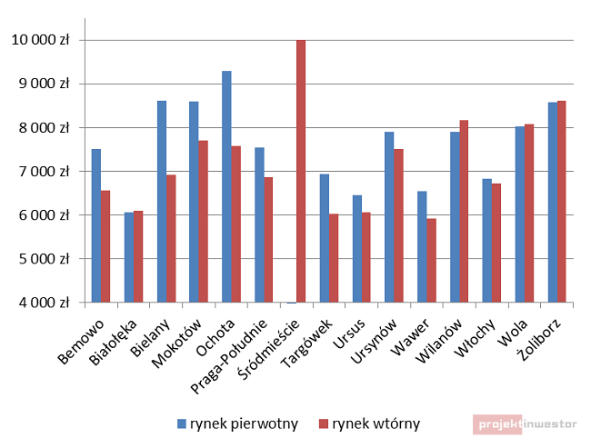 Zdecydowanie najdroższą dzielnicą Warszawy jest Śródmieście, acz ze względu na dostępność gruntów nowych inwestycji jest tu jak na lekarstwo. Aktualnie transakcje na śródmiejskim rynku pierwotnym stanowią mniej niż 1 proc. stołecznych transakcji, co ciekawe, jeszcze w 2013 r. było to 6-7 proc. Z tego względu statystyki NBP pomijają tę dzielnicę – ceny znacząco odbiegają od reszty i ze względu na niewielką liczbę transakcji są bardzo zmienne. Najwięcej mieszkań buduje się obecnie na Mokotowie i Białołęce, dalej są Wola, Targówek i Praga-Południe.
