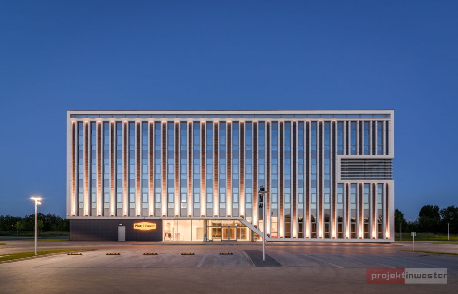 - Inwestor nie postawił nam konkretnych wymogów co do formy czy stylu nowego biurowca. Oczekiwał obiektu rozpoznawalnego w kontekście otoczenia, wykonanego z dobrych i trwałych materiałów – opowiada architekt Marcin Cellary. – Po 4 miesiącach pracy przedstawiliśmy firmie Piotr i Paweł projekt czterokondygnacyjnego budynku o oryginalnej bryle i powierzchni ponad 4 tysiące mkw., zaprojektowanego w aluminium, szkle oraz ceramice, które połączyliśmy w postać równomiernie rozłożonych pilastrów. Harmonijny i uporządkowany układ podkreśliliśmy ramą biegnącą po konturze biurowca.