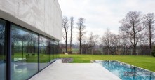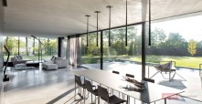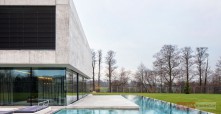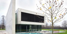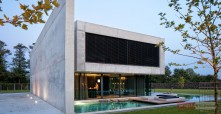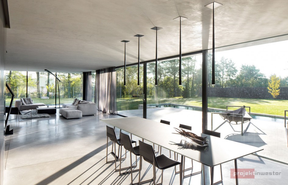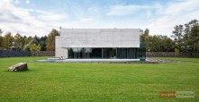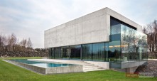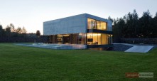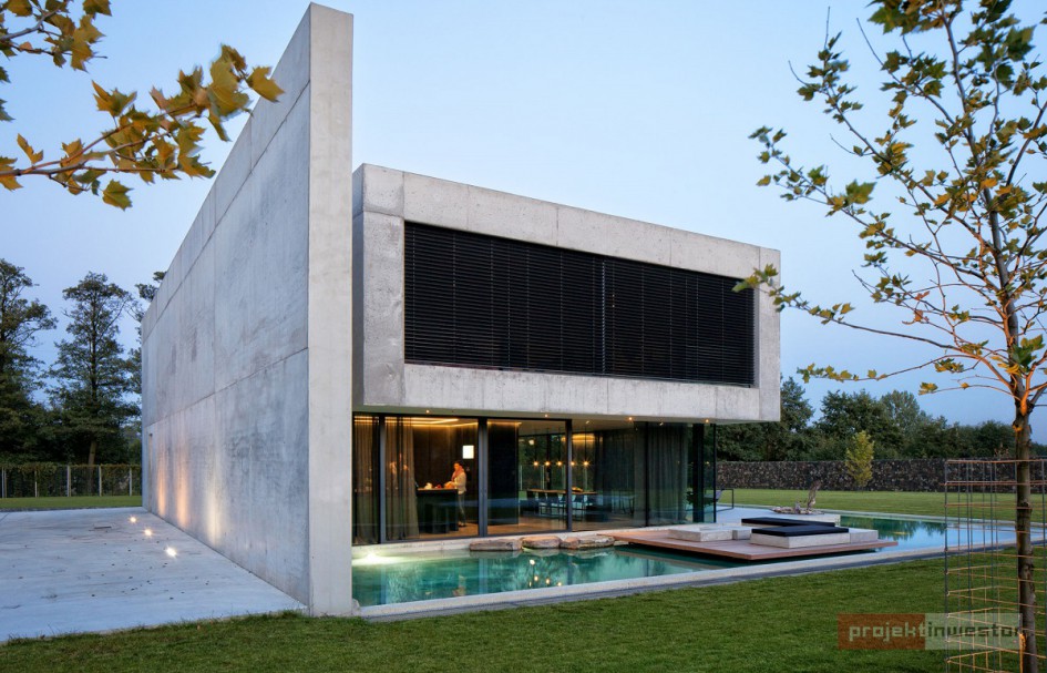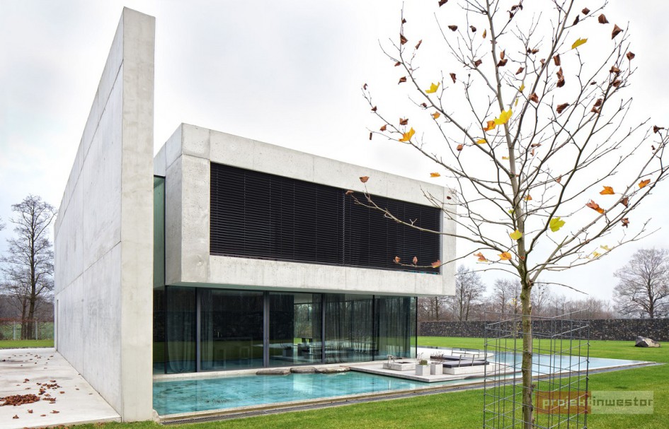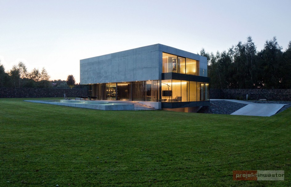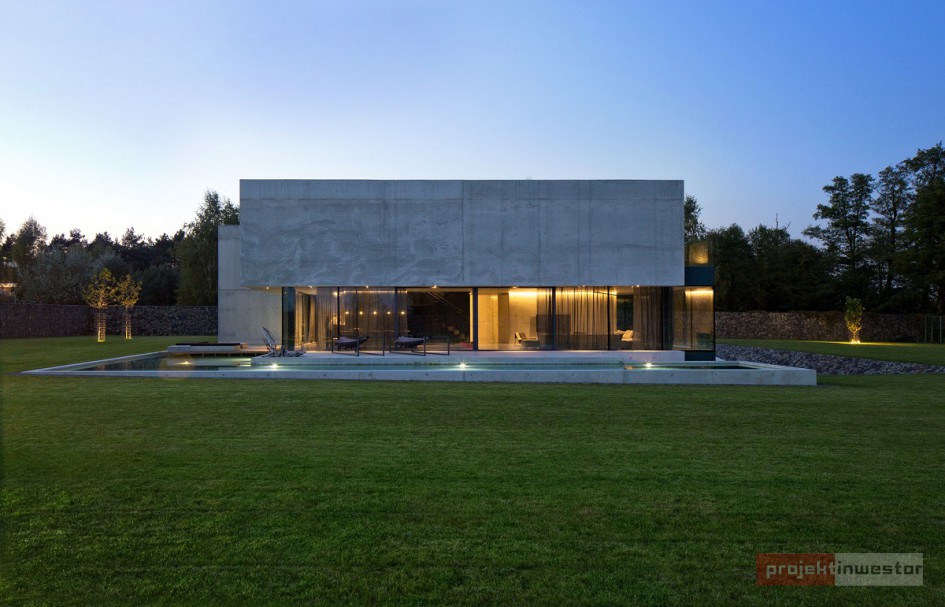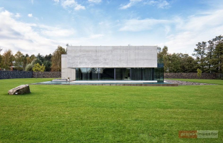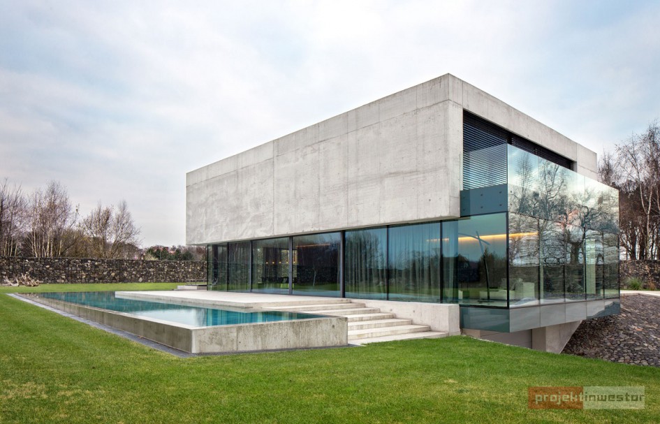 Budynek jest prostą, betonową bryłą z przeszklonym parterem. Dom swoją formą, minimalizmem oraz materiałami, z których został wykonany przypomina nowoczesne muzeum Brama Poznania ICHOT, o którym również pisaliśmy w kontekście Polskich Pereł Architektury. Istotnym elementem projektu db 2 architekci jest woda, która okala dom z dwóch stron, a jej powierzchnia tworzy refleksy na ścianach budynku.