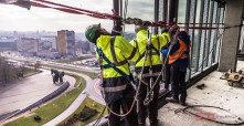 Całość prac montażowych została wykonana za pomocą technik alpinistycznych. Na budowie pojawiły się pierwsze zewnętrzne podesty wiszące, z których będzie montowana elewacja dachu technicznego, składająca się z elementów betonowych GRC oraz siatek cięto-ciągnionych.