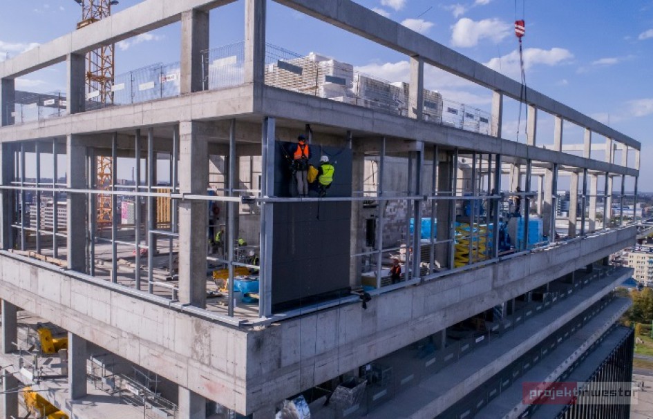 Prace przy budowie biurowca .KTW I sięgnęły ostatnich kondygnacji. Od kilku tygodni prowadzone są aktywne działania na tzw. dachu technicznym, gdzie przybywa nowej infrastruktury. Jednocześnie generalny wykonawca przygotowuje teren inwestycji pod przyszły układ drogowy.