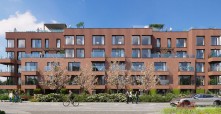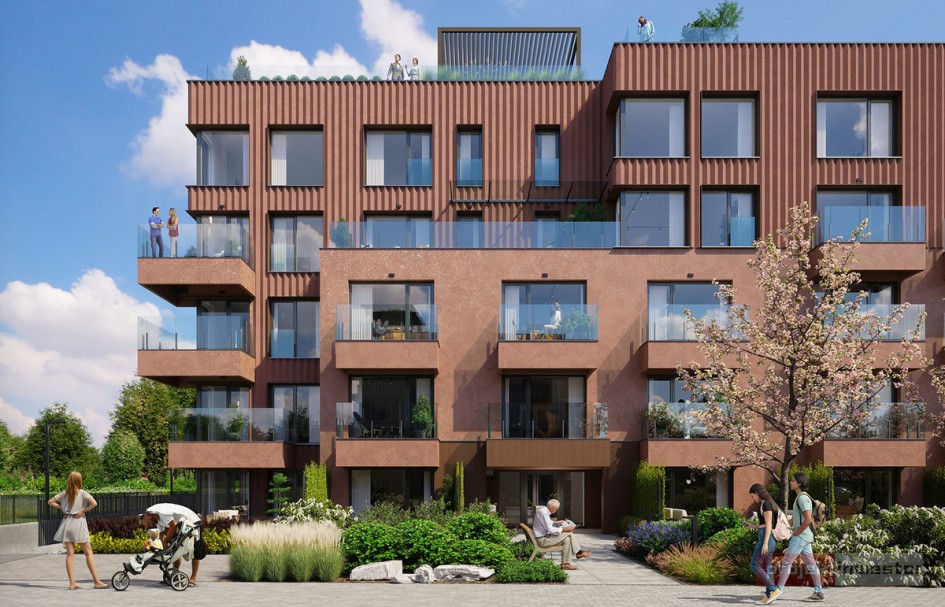 Forma architektoniczna budynku opiera się na wyraźnej, geometrycznej kompozycji elewacji. Zastosowano regularny, kubistyczny układ okien i balkonów oraz jednolitą kolorystykę w odcieniu ugry. Rozwiązania te porządkują bryłę obiektu i nadają jej spójny charakter, wynikający z przyjętych założeń projektowych.