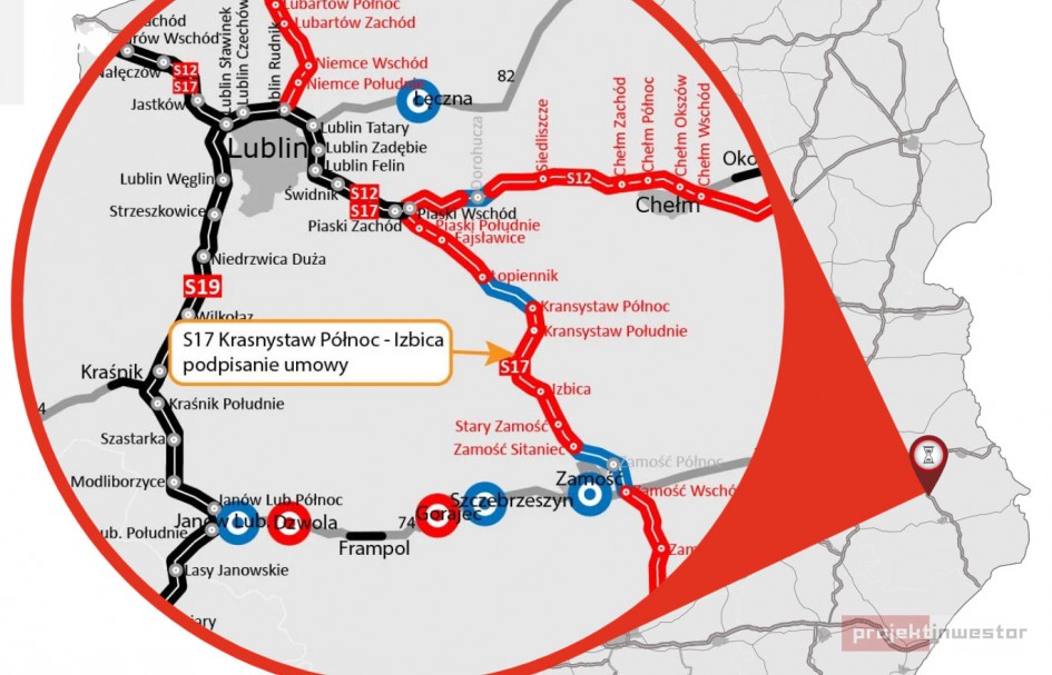 Generalna Dyrekcja Dróg Krajowych i Autostrad zleca natomiast Budimex wybuduje. Podpisano dokumenty w sprawie realizacji prawie dziewiętnastokilometrowego odcinka trasy prowadzącej od węzła Krasnystaw Północ do węzła Izbica.