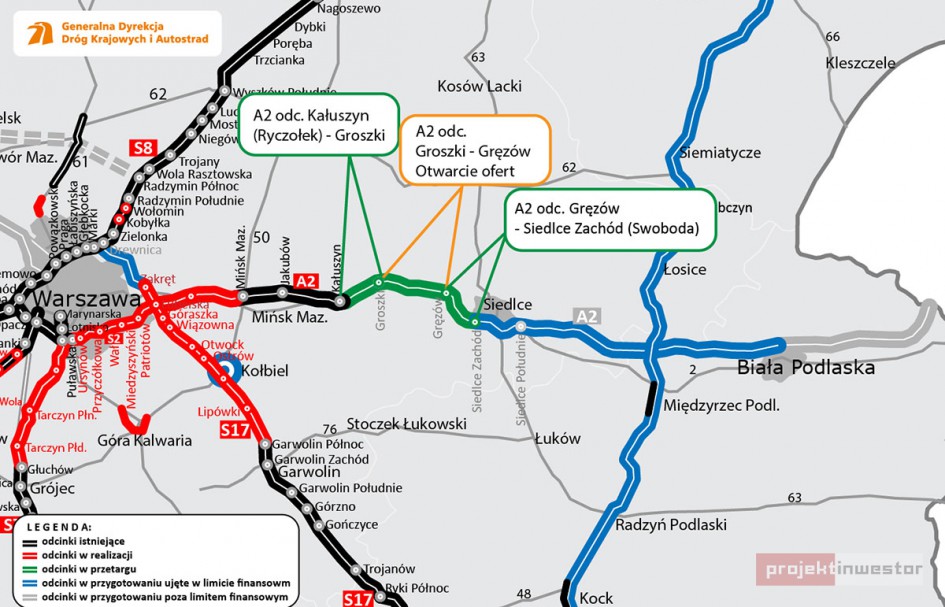 Osiem ofert, ale tylko dwie mieszczą się w planowanym budżecie. Generalna Dyrekcja Dróg Krajowych i Autostrad otworzyła koperty z ofertami na zaprojektowanie i budowę drugiego z trzech odcinków autostrady A2 pomiędzy węzłem Kałuszyn, stanowiącym koniec obwodnicy Mińska Mazowieckiego, a początkiem obwodnicy Siedlec. Tym razem chodzi o ponad 13-kilometrowy fragment od węzła Groszki do węzła Gręzów.