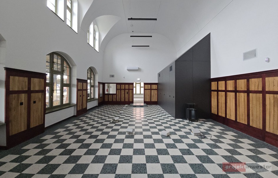 Neogotycki budynek, zaprojektowany na początku XX wieku, przeszedł kompleksową renowację. Odrestaurowano elewację, uzupełniono braki w cegle, a stolarkę okienną i drzwiową odtworzono w historycznym stylu. Szczególnie przyciągają uwagę herby na fasadzie oraz imponujące okno witrażowe nad głównym wejściem. Wnętrza zyskały nowoczesny charakter, zachowując jednak historyczne detale, takie jak witraże. Dla podróżnych przygotowano ergonomiczne ławki, zaktualizowane tablice rozkładów jazdy oraz nowoczesne toalety i pokój dla opiekuna z dzieckiem. W budynku przewidziano także miejsce na lokal komercyjny oraz hostel.