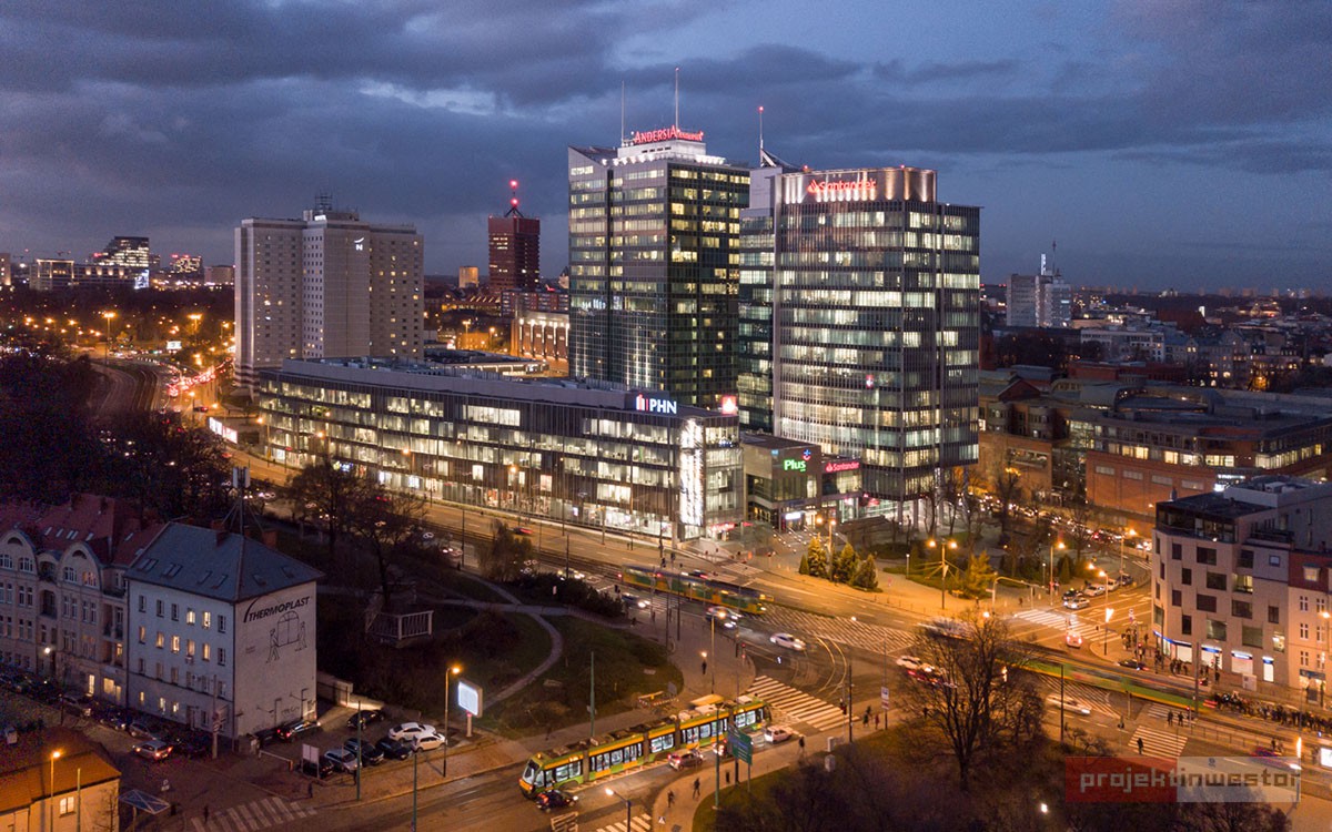Kompleks biurowy przy pl. Andersa w Poznaniu. Andersia Tower (z lewej), Poznańskiej Centrum Finansowe (z prawej), Andersia Business Centre (u dołu), fot. igen aerials
