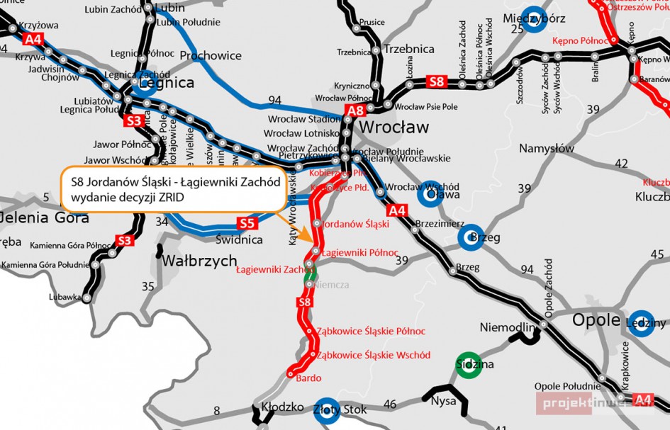 Wojewoda Dolnośląska wydała decyzję ZRID, umożliwiając rozpoczęcie budowy odcinka drogi ekspresowej S8 pomiędzy węzłami Jordanów Śląski i Łagiewniki Zachód. To pierwszy fragment trasy na południe od Wrocławia, który uzyskał zgodę na realizację.