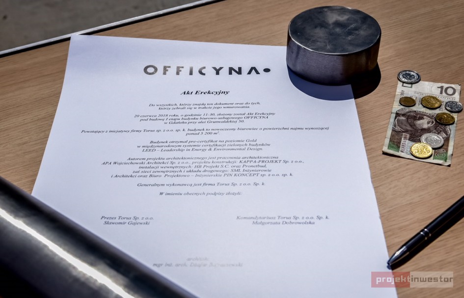 W dniu 20 czerwca wmurowano kamień węgielny pod budowę I etapu biurowca Officyna, powstającego w gdańskiej dzielnicy Wrzeszcz. Obiekt dostarczy na rynek 5,2 tys. mkw. powierzchni najmu, w tym blisko 4,2 tys. mkw. z przeznaczeniem na biura. Planowany termin oddania budynku do użytku to III kwartał 2019 roku. Łącznie w ramach dwóch etapów inwestycji powstanie 11 tys. mkw. powierzchni najmu, w tym ponad 9 tys. mkw. biurowej.