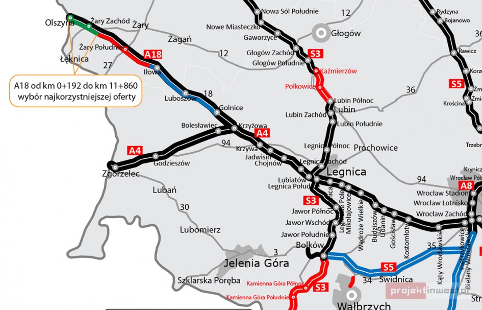 Generalna Dyrekcja Dróg Krajowych i Autostrad podpisała z firmą budowlaną umowę na przebudowę około 12 kilometrów drogi krajowej nr 18. Po zakończeniu prac budowlanych trasa stanie się odcinkiem o parametrach autostrady. Wartość kontraktu to ponad 185 mln złotych.