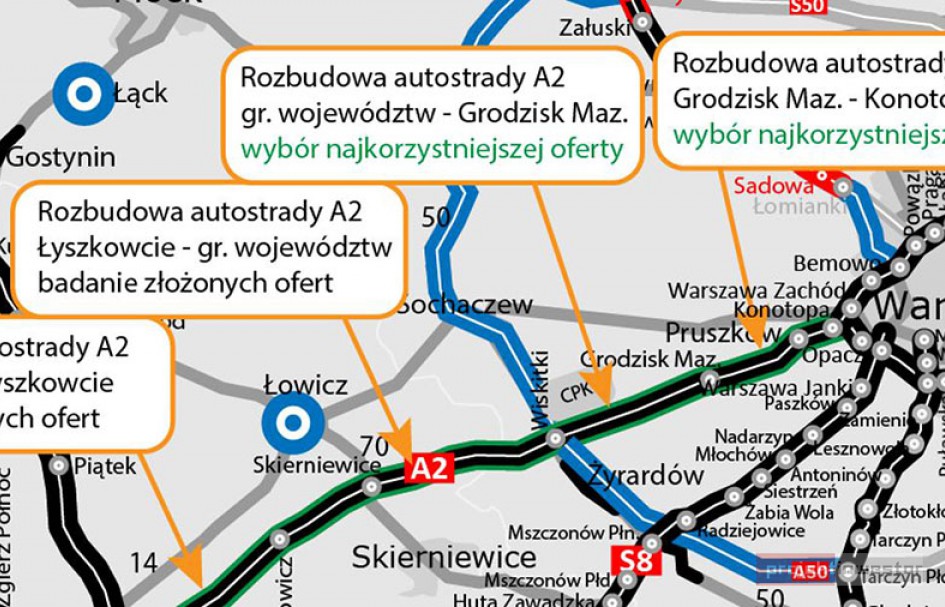 Postępowanie przetargowe dotyczące rozbudowy autostrady A2 między Łodzią a Warszawą weszło w decydującą fazę. Po analizie ofert wybrano najkorzystniejsze propozycje dla dwóch z czterech odcinków – od granicy województw łódzkiego i mazowieckiego do węzła Konotopa. Równolegle trwa szczegółowe badanie ofert złożonych dla pozostałych fragmentów trasy.
