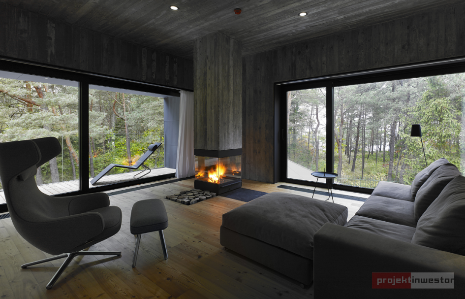 Materiałami dominującym są tutaj beton, drewno oraz blacha. Monolityczna konstrukcja żelbetowa wylana jest w formie jednolitej bryły. Jak opisują to architekci: - Beton stał się motywem przewodnim całej koncepcji, determinując także rozwiązania estetyczne we wnętrzach. Jego surowa szarość i faktura zostały w nich zrównoważone bielą niektórych ścian działowych i wizualnie ocieplone jasnym drewnem podłóg.