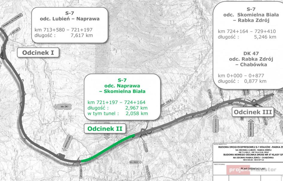 Wykonawcą ponad 2-kilometrowego tunelu na trasie górskiego odcinka drogi ekspresowej S7 została włoska firma Astaldi. W finale przetargu na odcinek tunelowy zakopianki pomiędzy Naprawą i Skomielną Białą znalazło się sześć firm i konsorcjów.