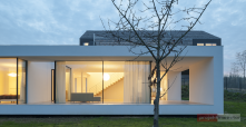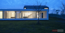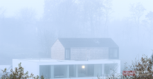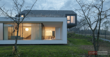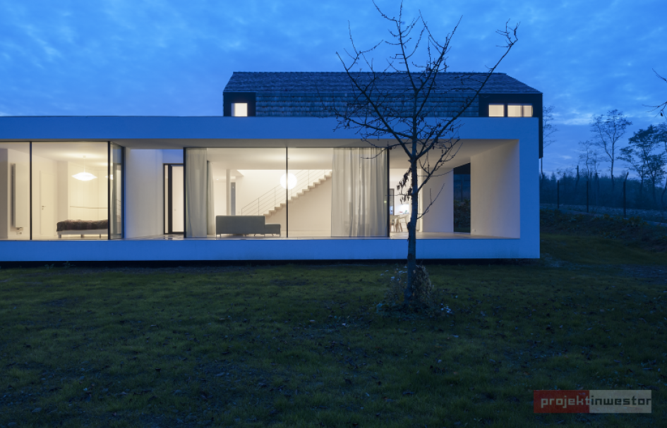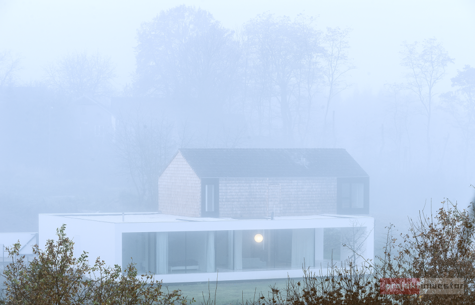 Dom 2 in 1 składa się z dwóch „pudełek”, które są nałożone na siebie i różnią się praktycznie wszystkim, tworząc dwa odrębne architektoniczne i funkcjonalne światy. Parter to nowoczesna i modernistyczna wariacja architektów na temat domu jednorodzinnego. Jest to prosta, minimalistyczna bryła z białą elewacją i przeszkleniami, która otwiera parter na ogród czyli sielankowe, wiejskie tereny z lasem w tle. Jest to miejsce, w którym znajduje się salon oraz sypialnia.