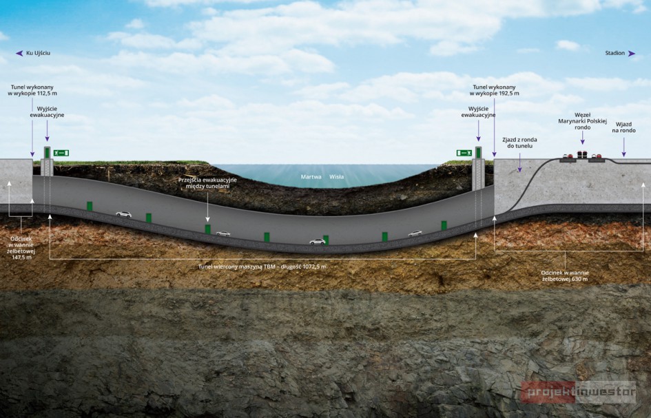 Wszystkie roboty realizowano w bardzo trudnych warunkach hydrogeologicznych Delty Wisły. Tunel przebiega przez warstwy gruntów na przemian sypkich i spoistych, które charakteryzują się słabą nośnością. Dodatkowym utrudnieniem przy realizacji robót fundamentowych był wysoki poziom zwierciadła wody gruntowej. W związku z tym wdrożono technologię wgłębienia wykopu „na sucho”, czyli po technicznym odcięciu dopływu wody gruntowej przez ściany i dno wykopu.
