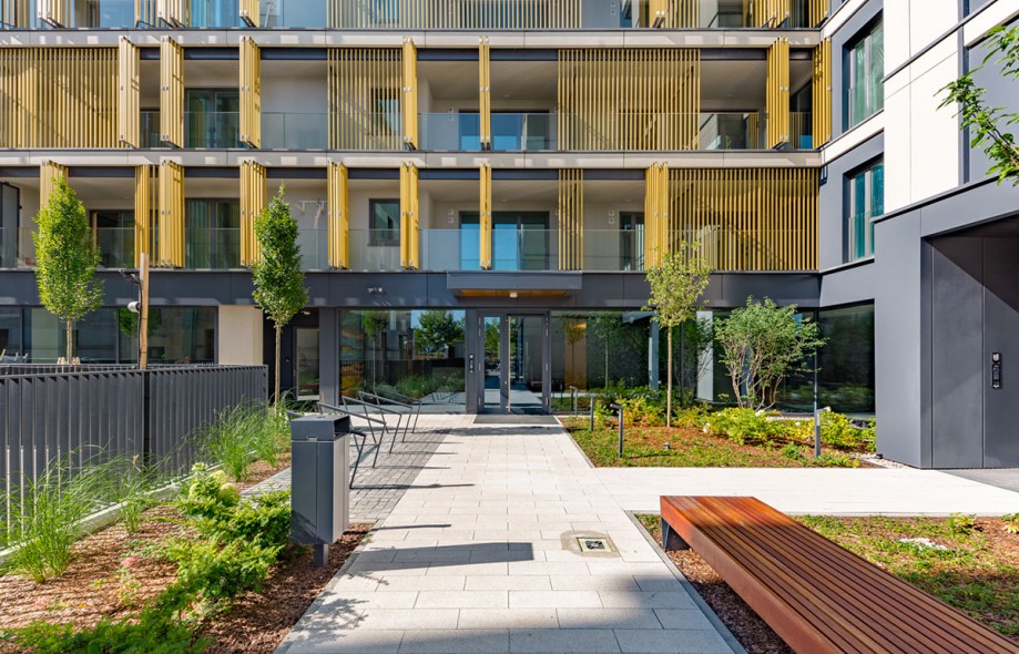 Do budynku prowadzi reprezentacyjne wejście. W foyer zlokalizowana została całodobowa recepcja, zaś w garażu podziemnych przewidziano miejsca postojowe dla rowerów.